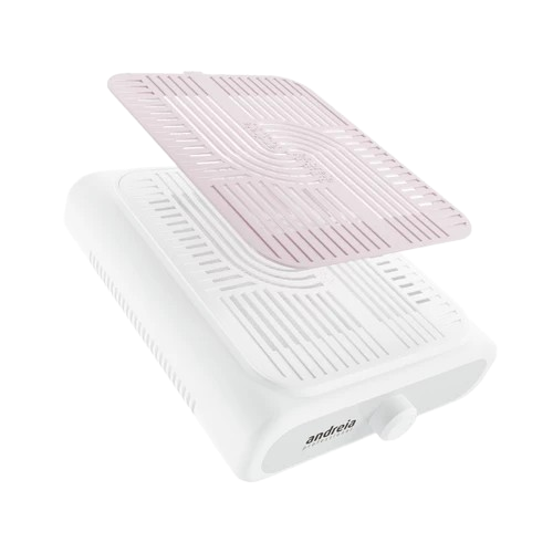 Quando precisa de mais controlo, o ajuste de velocidade responde com precisão. Para trabalhos delicados, reduz. Para limagens intensas, aumenta. A adaptação é intuitiva, fluida, sem perda de desempenho. As grelhas removíveis — branca e rosa — permitem personalização visual e limpeza rápida, enquanto o filtro substituível garante retenção eficiente das partículas mais finas.