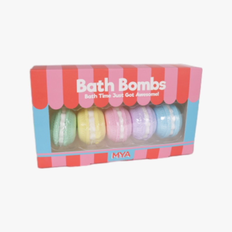 O pacote com 5 bombas de banho efervescentes MYA foi projetado para transformar sua rotina de banho em uma experiência de bem-estar total. Essas bombas, em formato de macarons coloridos, produzem bolhas, fragrâncias envolventes e um toque visual alegre assim que entram em contato com a água morna.