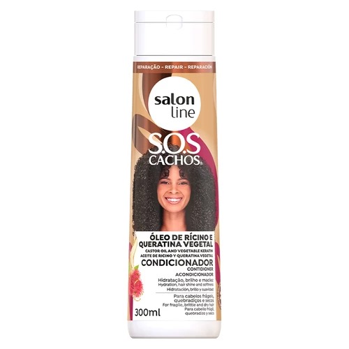 S.O.S Cachos Ricino y Keratin da Salon Line, é um condicionador de reparação extrema da raiz às pontas, indicado para cachos tipo 3ABC e 4ABC. Este condicionador reconstrói e age profundamente nutrindo e selando os fios da estrutura interna.